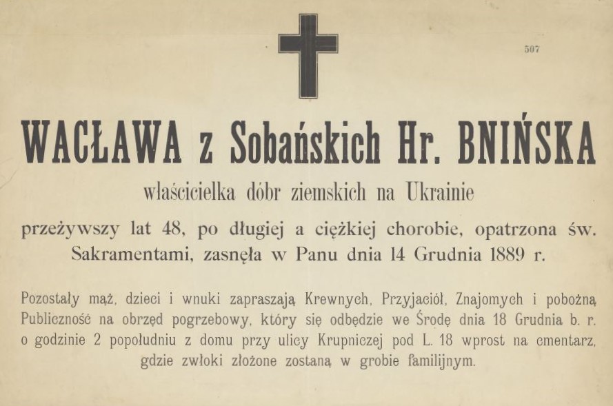 Podobnie jak pani Łagowska, hrabina Bnińska chciała podążać za swoim mężem na wygnanie, pomimo wszystkich starań, jakie podjął, aby ją od tego odwieść, jej ojciec, najbogatszy właściciel na Podolu, który obawiał się, że surowy klimat Syberii zaszkodzi jej chwiejnemu zdrowiu. Obawy starca były więcej niż uzasadnione; podczas straszliwej podróży, odważna kobieta, która do tej pory żyła w bogactwie, zaraziła się zarazkami choroby, która w przyszłości miała ją pokonać.