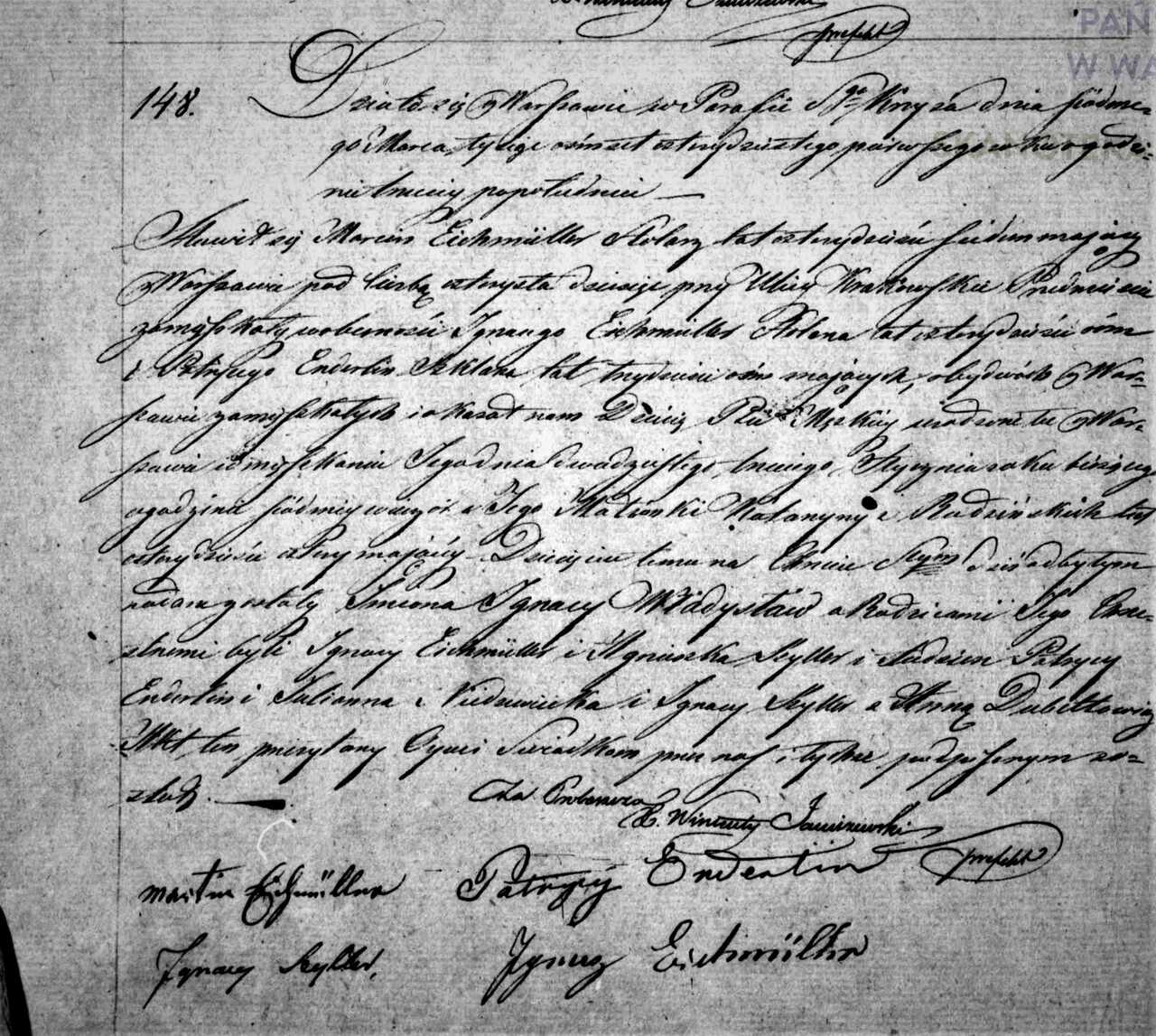 Z metryki z Kościoła Św. Krzyża wynika, że Ignacy Eichmiller urodził się w 1841 r. w Warszawie, a jego rodzice mieszkali wówczas na Krakowskim Przedmieściu. Eichmilerowie zajmowali się stolarstwem i on także wykształcił się w tym kierunku.