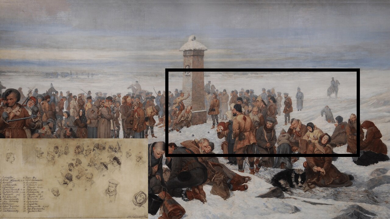 Aleksander Sochaczewski wybrał 30 prawdziwych postaci, często bohaterów historycznych wydarzeń i umieścił ich na symbolicznym obrazie Pożegnanie Europy, wśród bezimiennego tłumu. To moment przekraczania granicy Europy i Azji przez zesłanych Powstańców Styczniowych. Współcześni nam, wytknęli malarzowi, że wszystkie te postaci nie mogły spotkać się w jednym miejscu i w tym samym czasie. Tak to prawda, ale były to bardzo ważne osoby dla malarza, dlatego je sportretował razem i niejako unieśmiertelnił na swoim wielkim obrazie.